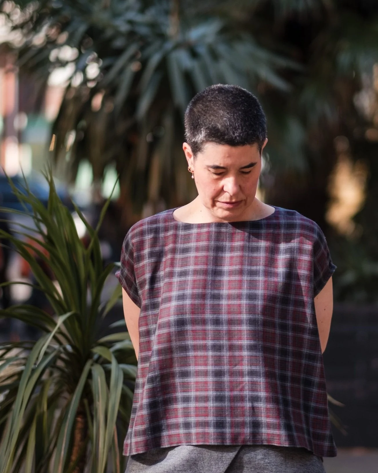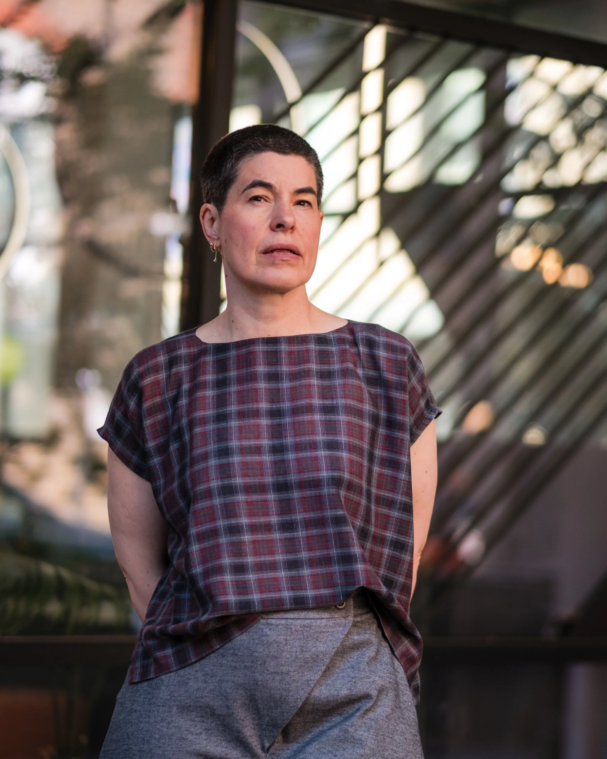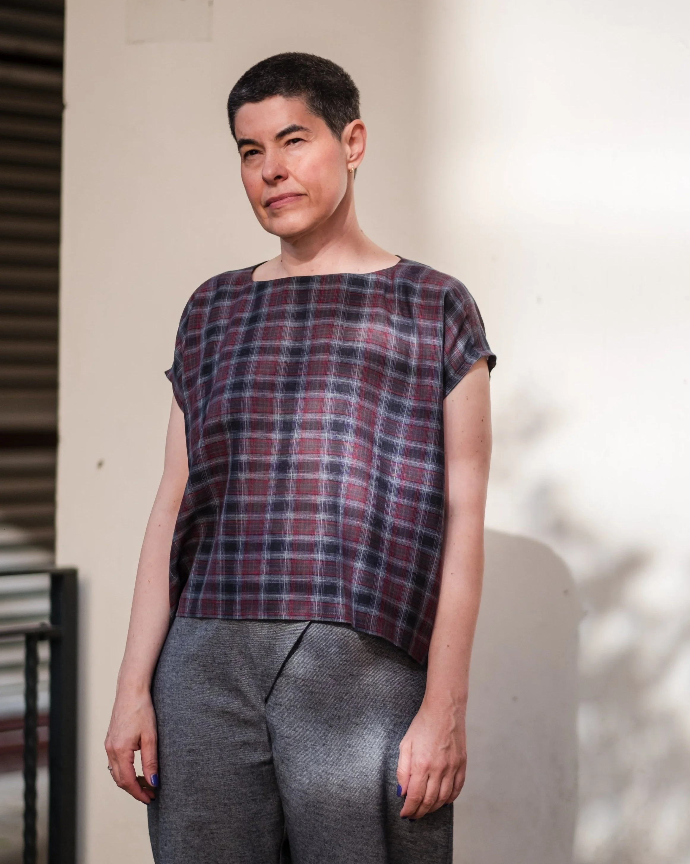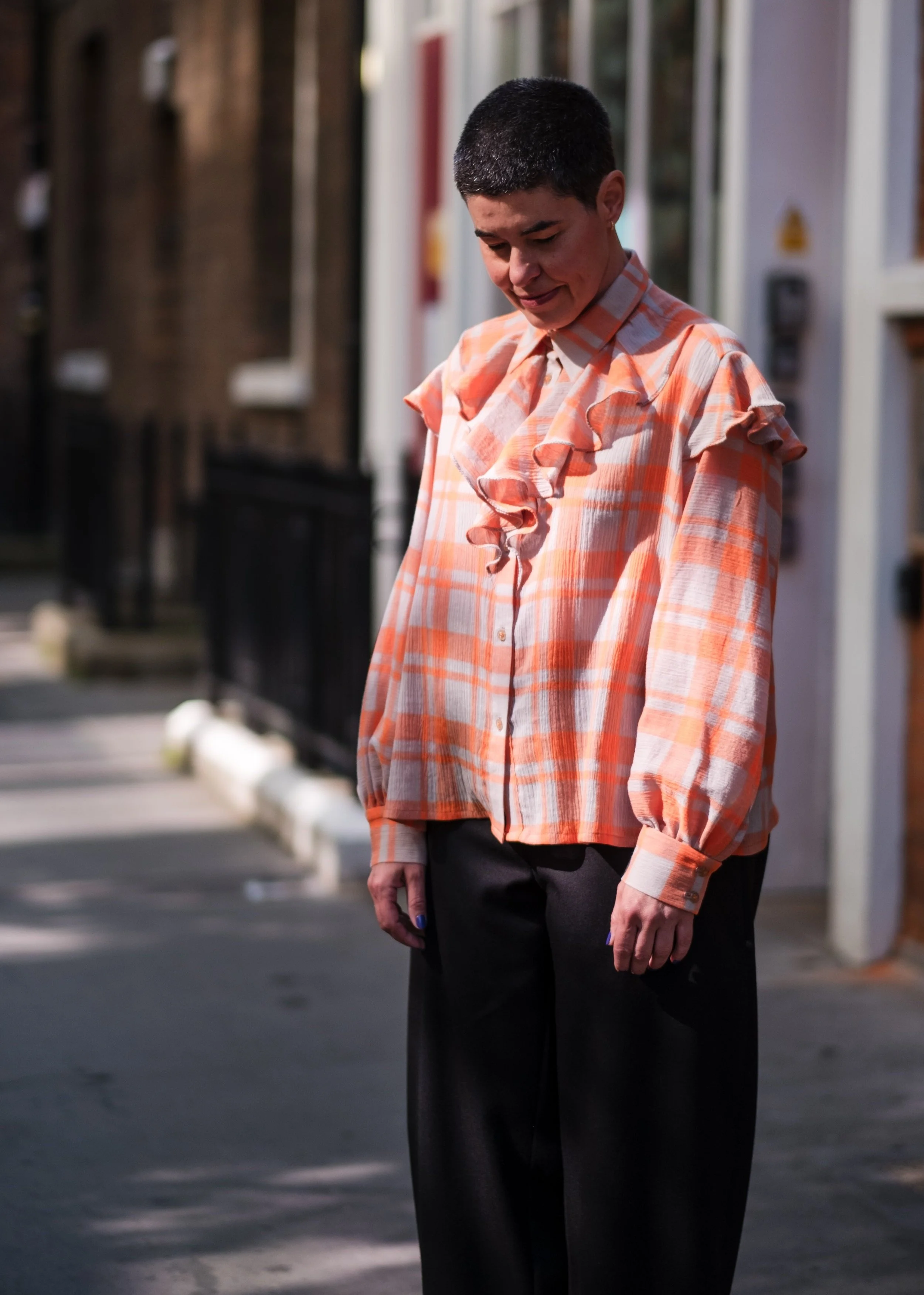 Fabric: Deadstock crinkle gauze, 100% cotton. Lightweight and fluid, with a soft hand, fluttering gently as you move. The orange and soft cream plaid is yarn-dyed for depth and texture, offering a quietly romantic take on checks.